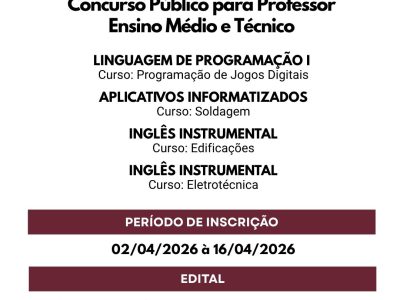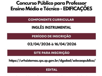 Processo Seletivo para Docente – Tecnologia dos Materiais de Construção Civil II – Ensino Médio com Edificações – De 04/02 até ás 23h59 de 18/02/2026