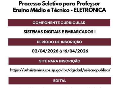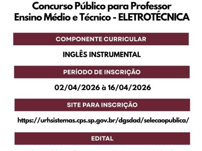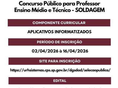 Inscrições de 02/04/2026 até 23h59 de 16/04/2026. Não perca tempo! Acesse o edital completo na aba Oportunidades e candidate-se agora. Link de inscrição: https://urhsistemas.cps.sp.gov.br/dgsdad/selecaopublica/