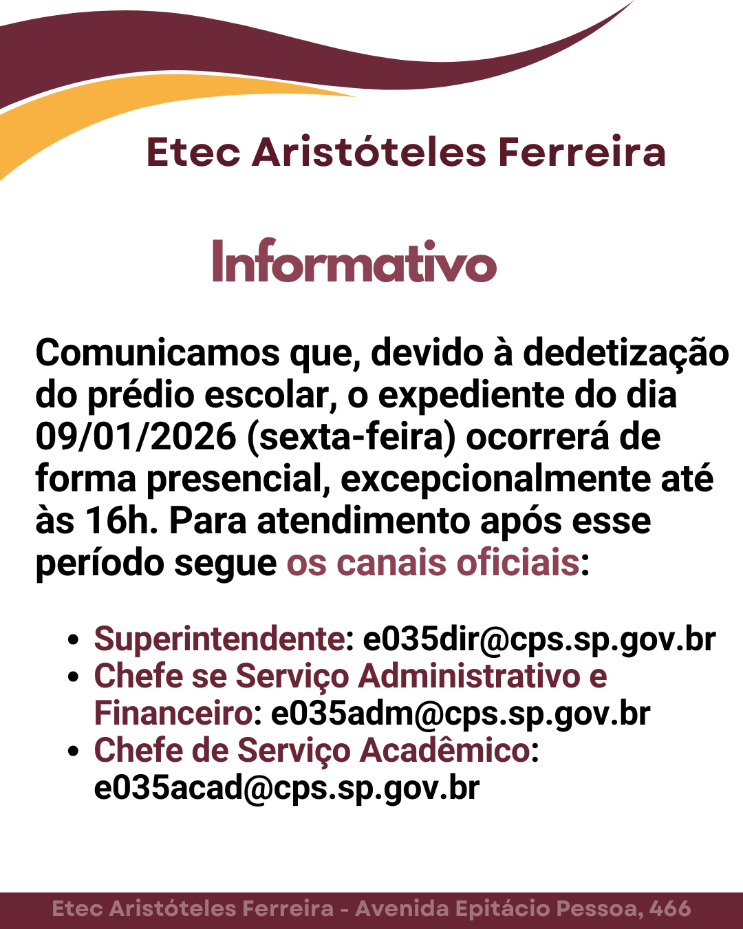 Comunicamos que, devido à dedetização do prédio escolar, o expediente do dia 09/01/2026 (sexta-feira) ocorrerá de forma presencial, excepcionalmente até às 16h. Para atendimento após esse período segue os canais oficiais: