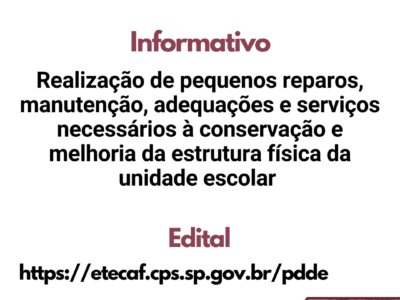 Comunicamos que, devido à dedetização do prédio escolar, o expediente do dia 09/01/2026 (sexta-feira) ocorrerá de forma presencial, excepcionalmente até às 16h. Para atendimento após esse período segue os canais oficiais:
