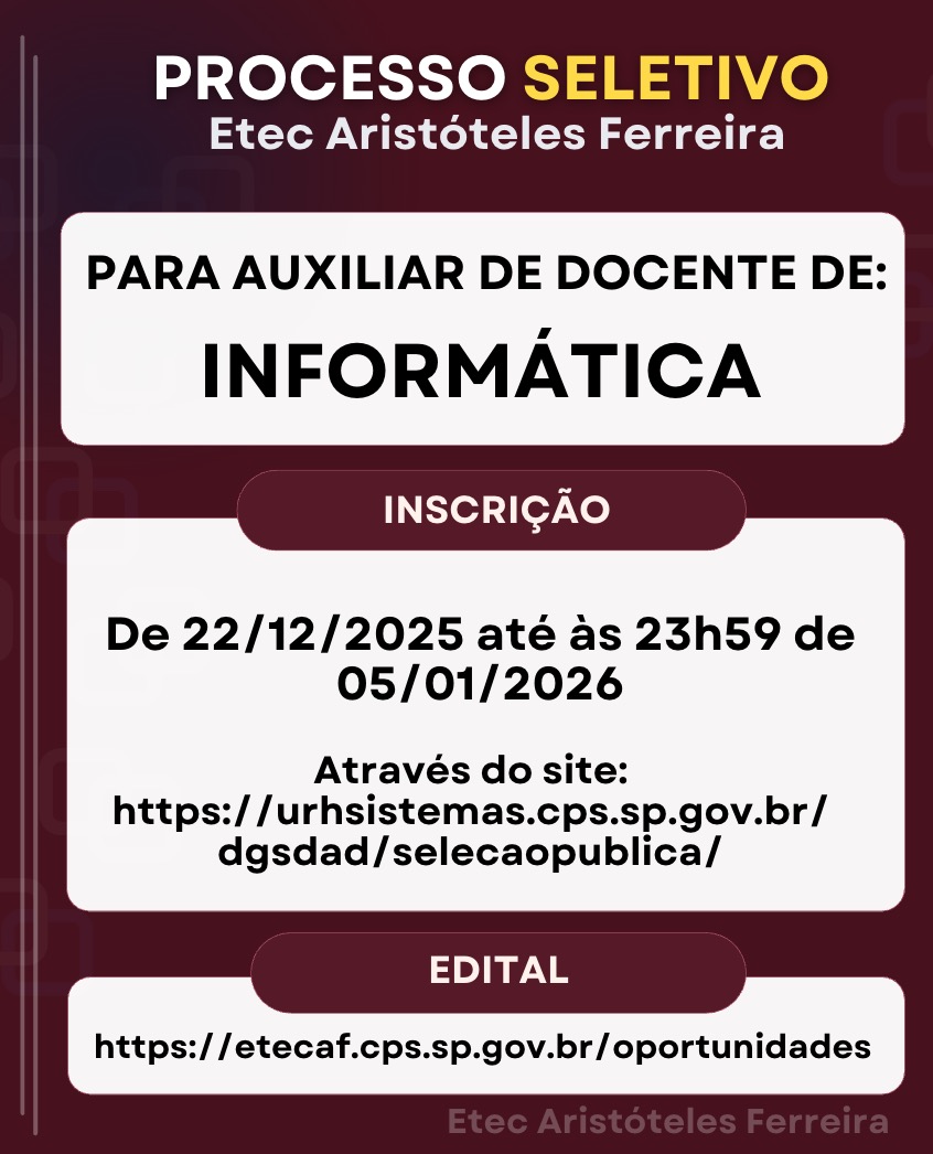 Processo Seletivo para Auxiliar Docente de Informática – https://etecaf.cps.sp.gov.br/oportunidades